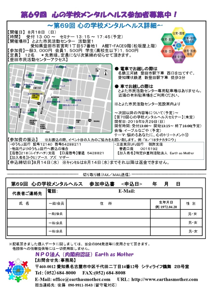 8月18日『第69回心の学校メンタルヘルス』 参加申込