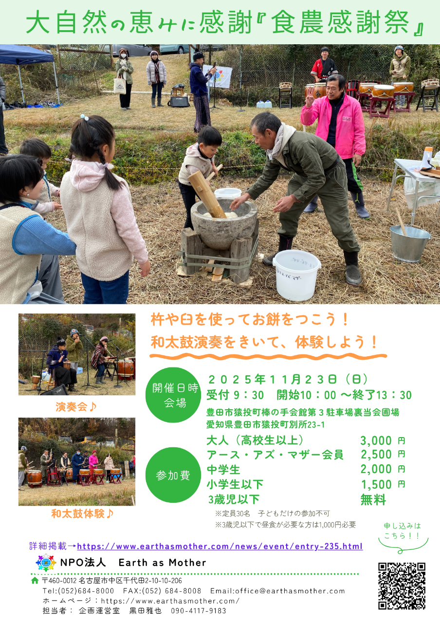 2025年11月23日 大自然の恵みに感謝『食農感謝祭』 杵や臼を使ってお餅をつこう! 和太鼓演奏をきいて、体験しよう!
