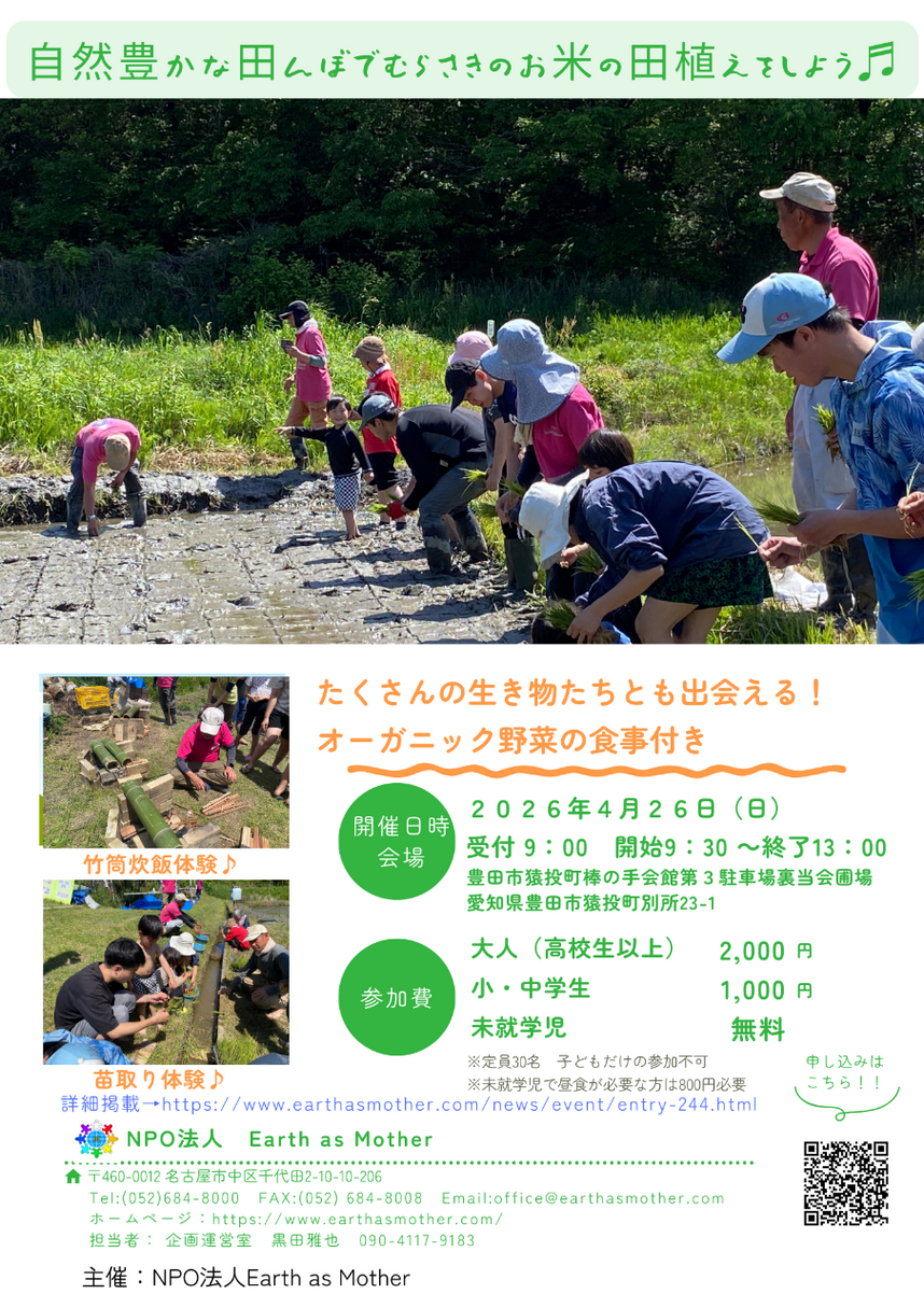 今年も豊田市の自然あふれる完全オーガニック(農薬、化学肥料、除草剤な不使用)の安心、安全な生き物のいっぱいの圃場にて、他では中々体験できない、むらさきのお米の田植え体験を行います。また、完全オーガニックのお米を使用した竹筒炊飯体験を行います。